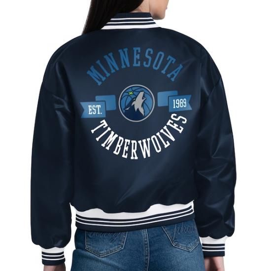 ミネソタティンバーウルブズ スターター レディース プリント ロゴ 短く切った サテン ヴィーシティ フル-Snap ジャケット - ネイビーはNBA公式グッズです。